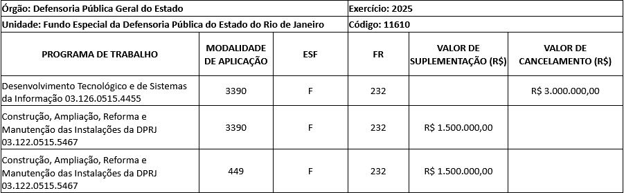 Art. 1º - Fica parcialmente alterado, na forma do Anexo, o Quadro de Detalhamento das Despesas da Defensoria Pública do Estado do Rio de Janeiro para o exercício financeiro de 2025.