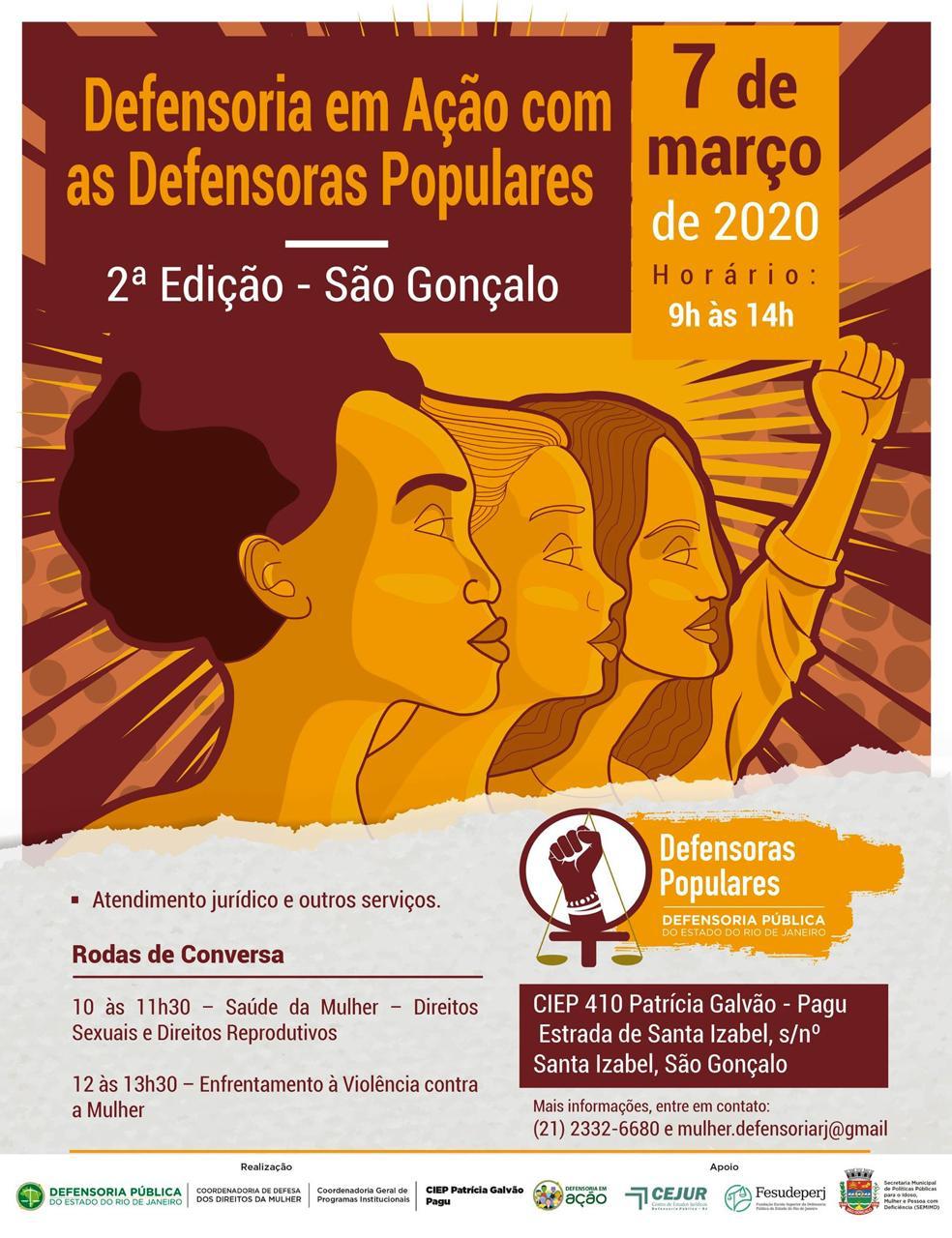 Recém-formadas no curso Defensoras Populares, 50 alunas participarão de mais uma Defensoria em Ação com as Defensoras Populares, para prestar orientação sobre cidadania e direitos à população de São Gonçalo. A atividade faz parte do projeto oferecido pela Coordenadoria de Defesa dos Direitos da Mulher e pelo Núcleo de Defesa das Mulheres Vítimas de Violência de Gênero (Nudem) da Defensoria Pública do Rio de Janeiro (DPRJ) e será realizada neste sábado (7), em razão do Dia Internacional das Mulheres, celebrado no domingo (8).