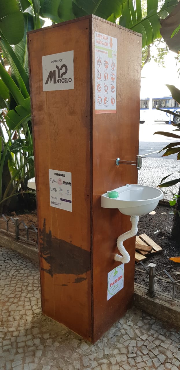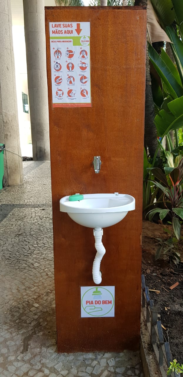 Idealizada pela engenheira Ana Paula Rios também para a higiene das mãos de quem trabalha na pandemia, a pia portátil tem estrutura em madeirite de fácil transporte e instalação. Se abastecida em média duas vezes ao dia, pode gerar 4.500 lavagens por mês. A idealizadora do projeto informa ainda que o custo mensal é de seis centavos por lavagem, e que não há prazo determinado para a retirada da estrutura.