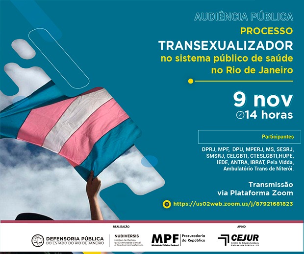 Defensoria Pública e o Ministério Público Federal irão realizar uma audiência pública, na próxima segunda-feira, 09, às 14h, sobre “O processo transexualizador no sistema público de Saúde no Rio de Janeiro”. O evento pretende discutir a necessidade de melhoria do serviço público de saúde oferecido à população trans, através do SUS, a capacitação de profissionais para atendimento especializado, entre outros assuntos. A audiência será transmitida pela plataforma Zoom pelo link.
