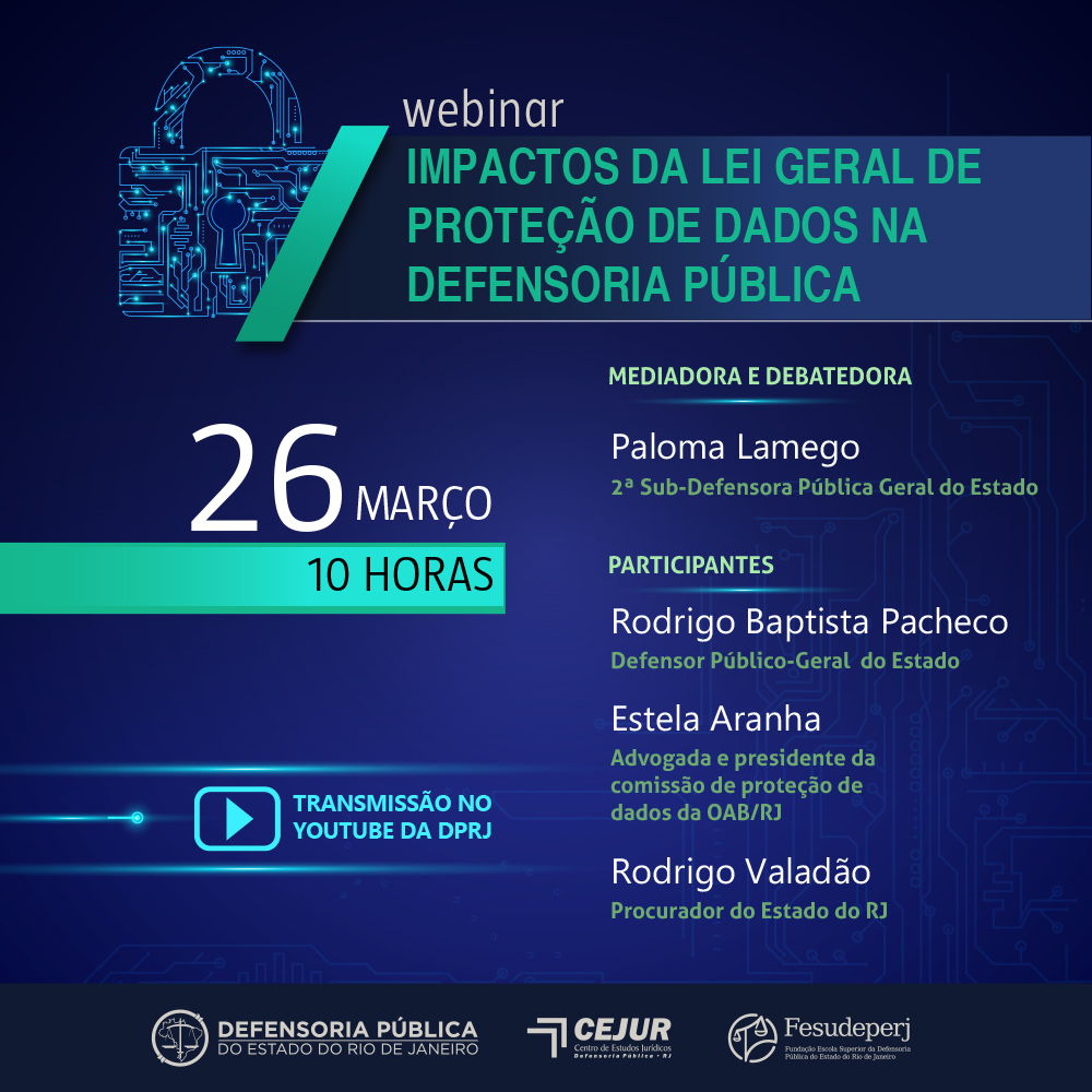 Além de elucidar os pilares da LGPD, a webinar também pretende abordar de que forma a lei vai impactar diretamente o trabalho da DPRJ. Alguns temas que serão debatidos são a importância de proteger os dados dos assistidos e quais ações práticas devem ser tomadas para promover essa proteção; quais as consequências do descumprimento da lei para a Defensoria; e o que a Defensoria já vem realizando nesse sentido.