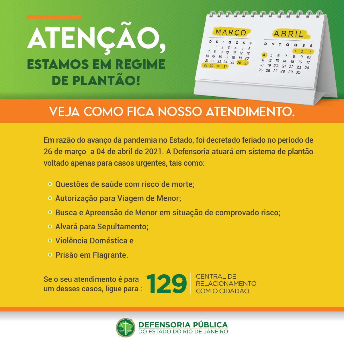 De 26 de março a 4 de abril, a Defensoria Pública do Rio de Janeiro funcionará em regime de plantão, seguindo determinação da lei aprovada pela Assembleia Legislativa do Rio (Alerj).
