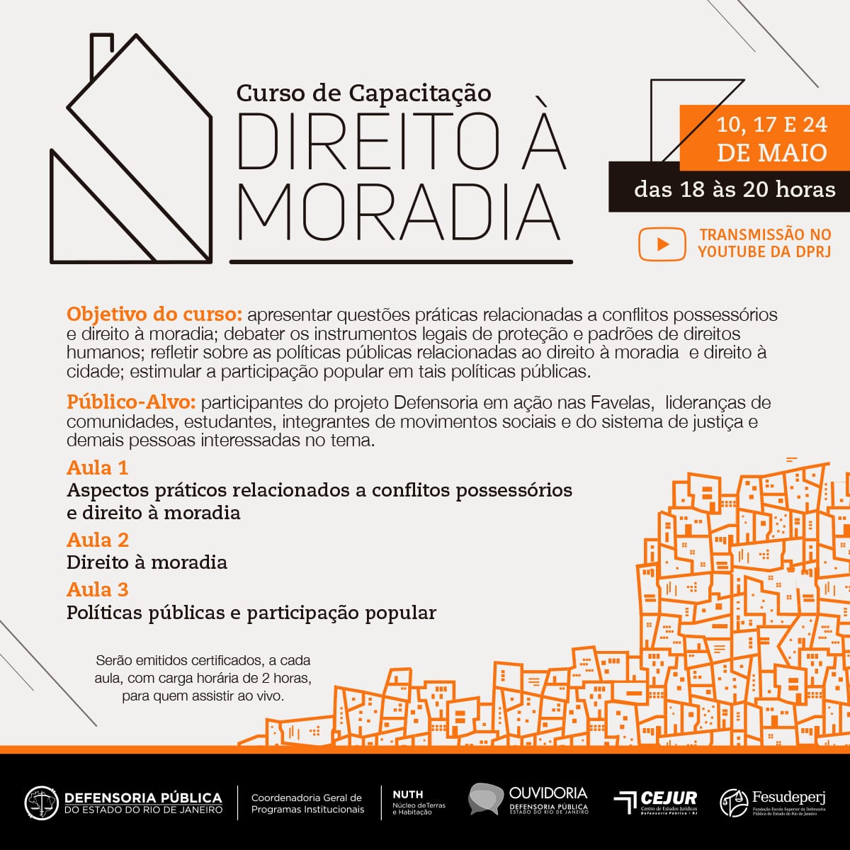 A Defensoria Pública do Rio de Janeiro (DPRJ) promoverá nos dias 10, 17 e 24 de maio, das 18h às 20h, aulas online do Curso de Capacitação Sobre Direito à Moradia. A ideia, que surgiu a partir da capacitação de lideranças envolvidas no projeto Defensoria em Ação nas Favelas, se baseia na necessidade de ampliação do debate sobre o direito à moradia e envolvimento de organizações em campanhas que tratam do mesmo tema, como a “Despejo Zero”. Os encontros acontecerão de forma remota e serão transmitidos no canal da DPRJ no Youtube.