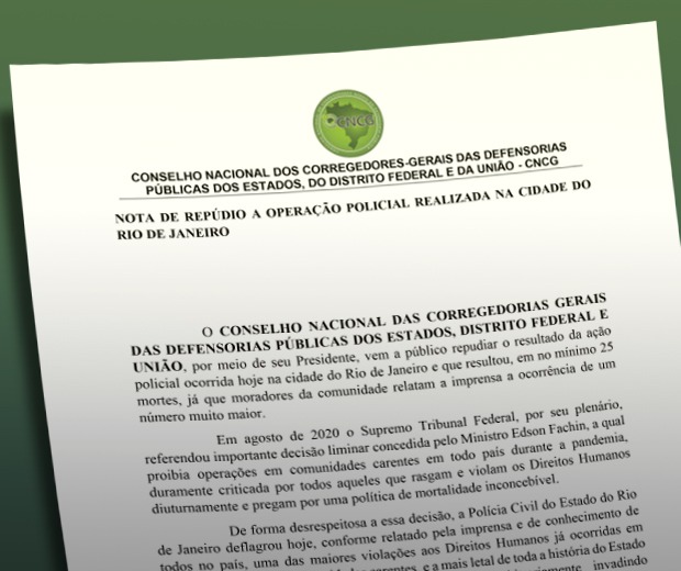 O Conselho Nacional das Corregedorias Gerais das Defensorias Públicas dos Estados, Distrito Federal e União, por meio de seu presidente Marcus Edson de Lima, veio a público repudiar o resultado da ação policial ocorrida na semana passada na cidade do Rio de Janeiro e que resultou, em no mínimo 25 mortes, já que moradores da comunidade relatam a imprensa a ocorrência de um número muito maior.
