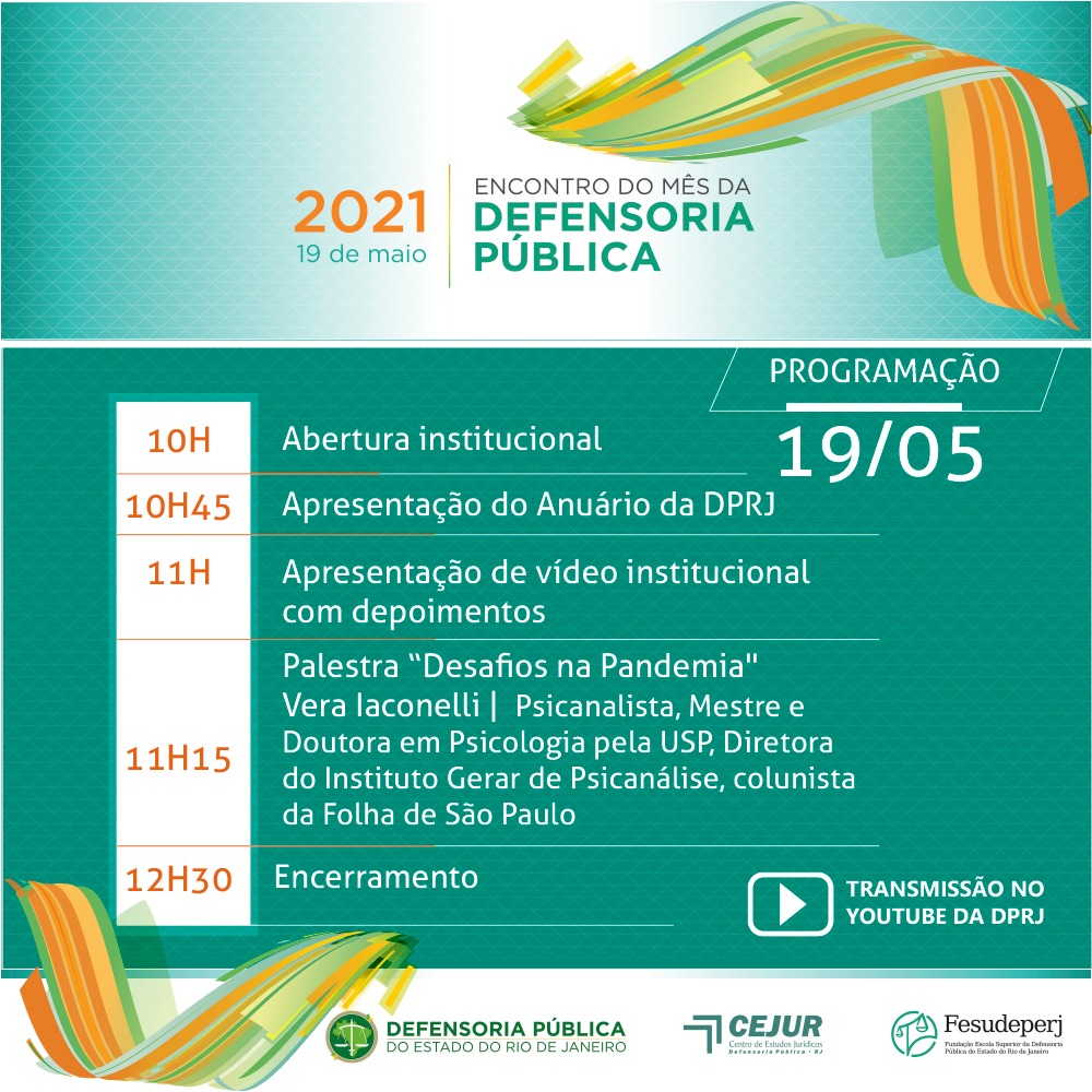 Logo em seguida, às 10h, terá início o Encontro do Mês da Defensoria Pública, evento que contará com palestra e exibição de vídeos institucionais com depoimentos de defensores e defensoras sobre os desafios do trabalho durante a pandemia de Covid-19. Os(as) assistidos(as) também falarão sobre o impacto da atuação da DPRJ nesse momento tão difícil.