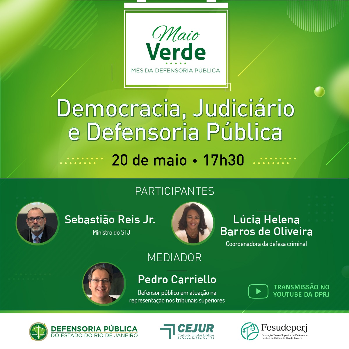 Discutir a fase atual da democracia brasileira, que passa pelo respeito às instituições, e o papel da Defensoria nesse processo será um dos focos do webinar "Democracia, Judiciário e Defensoria Pública", amanhã (20), às 17h30. O evento terá participação do ministro do Superior Tribunal de Justiça (STJ) Sebastião Reis Jr e a da defensora pública do Rio, Lucia Helena Oliveira, coordenadora de defesa criminal. A mediação ficará por conta do também defensor público Pedro Carriello, que atua na representação nos tribunais superiores.