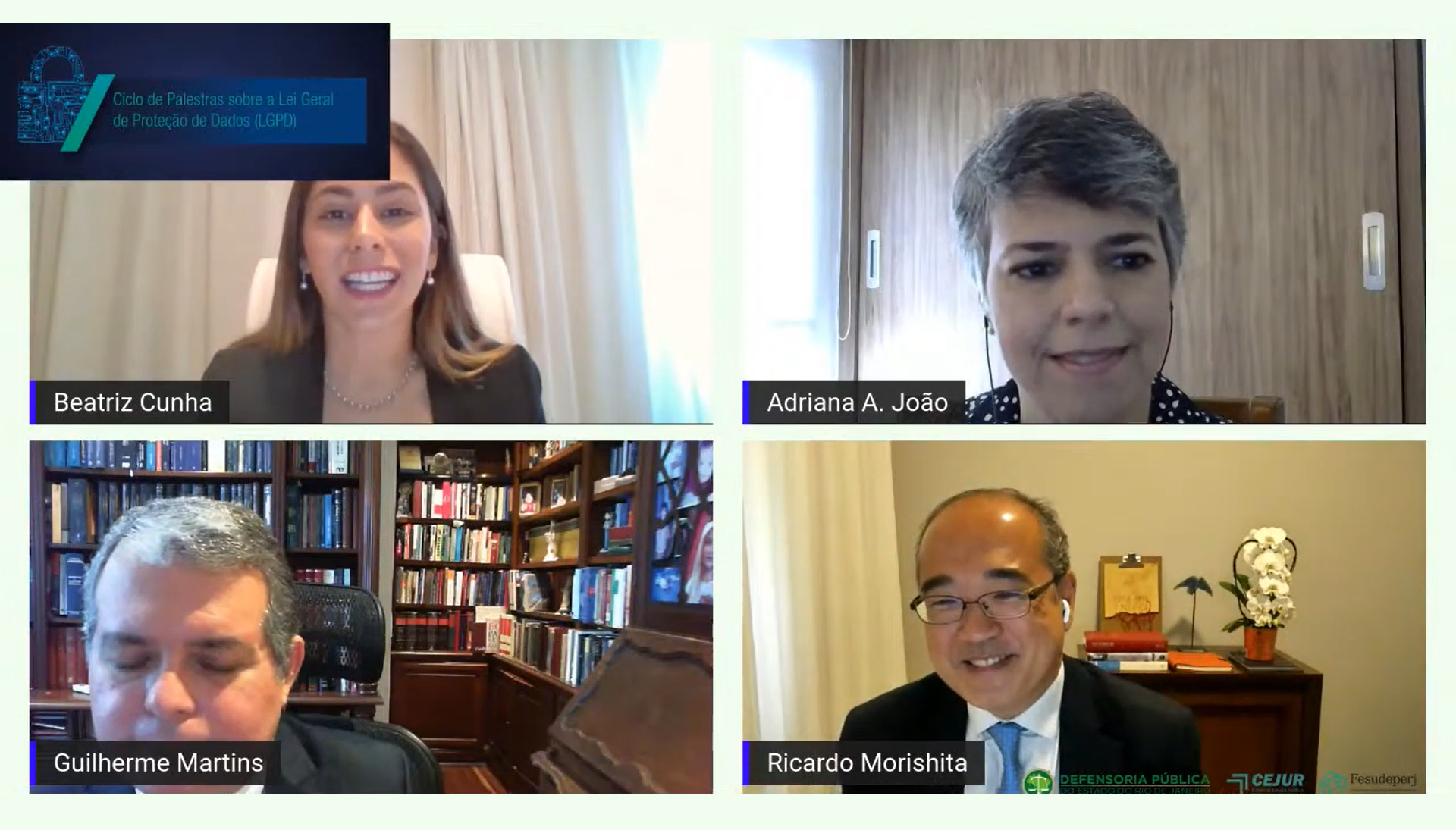 No encontro desta semana, a proteção de dados foi debatida junto ao direito do consumidor. Além do procurador Guilherme Martins, estiveram presentes o advogado e professor do Instituto Brasileiro de Ensino, Desenvolvimento e Pesquisa (IDP) e do Centro Universitário de Brasília (UniCeub), Ricardo Morishita; e a defensora pública e subcoordenadora do Núcleo de Defesa do Consumidor (NUDECON), Adriana João. A mediação ficou a cargo da encarregada de proteção de dados e subcoordenadora cível da DPRJ, Beatriz Cunha.