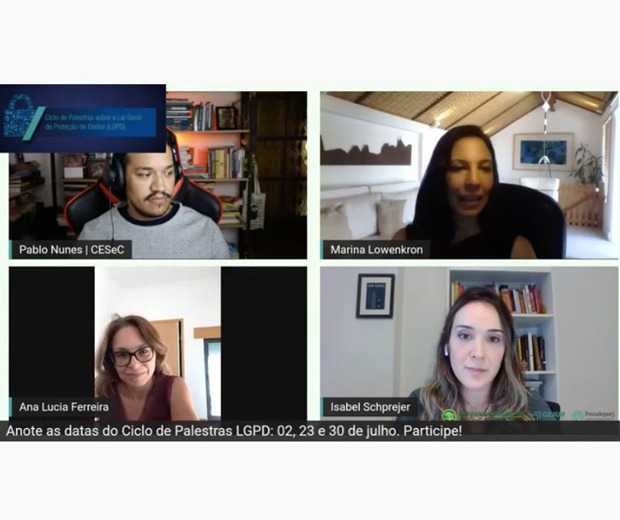 O encontro desta semana teve como tema a proteção de dados e o sistema penal e contou com a participação do cientista político e coordenador adjunto do Centro de Estudos de Segurança e Cidadania (CESeC), Pablo Nunes; da subcoordenadora de Defesa Criminal, Isabel Schprejer; além da defensora pública Ana Lúcia Ferreira. A mediação ficou a cargo da encarregada de Proteção de Dados Marina Lowenkron.