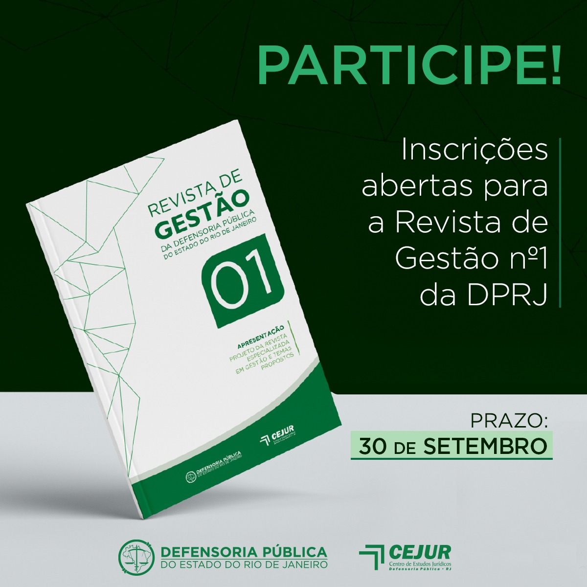 Estão abertas, até 30 de setembro, as inscrições para o envio de trabalhos e artigos para compor a primeira edição da Revista de Gestão da Defensoria Pública. A publicação é uma iniciativa do Centro de Estudos Jurídicos da Defensoria Pública do Rio de Janeiro (CEJUR), com apoio da Secretaria de Engenharia.