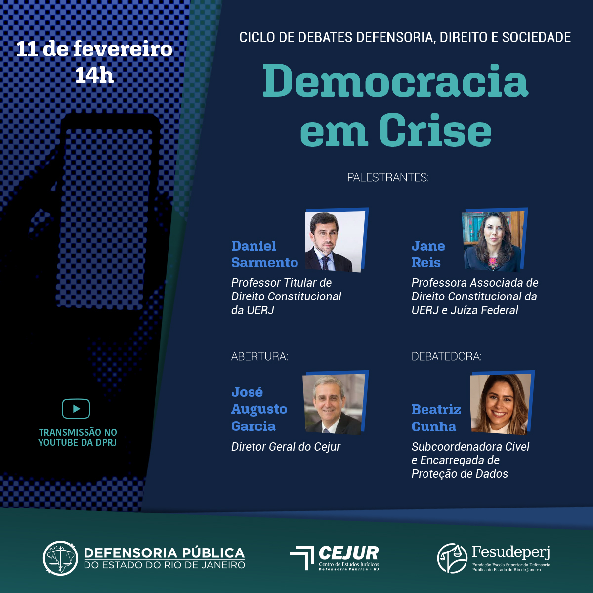 A Defensoria Pública do Rio de Janeiro (DPRJ) realizará, nesta sexta-feira (11), mais uma edição do Ciclo de Debates “Defensoria, Direito e Sociedade”. O webinar, que será transmitido no canal da instituição no Youtube a partir das 14h, terá como tema a “Democracia em Crise” e colocará em pauta temas como a situação brasileira e o fenômeno mundial das guinadas autoritárias pela via eleitoral.