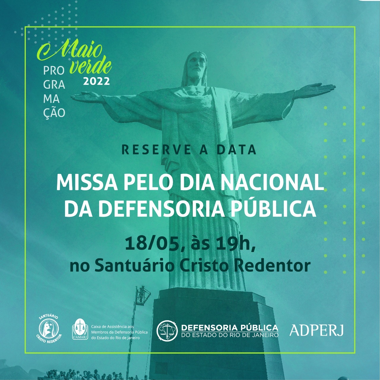 Após dois anos de comemorações online, a tradicional missa do Dia Nacional da Defensoria Pública (19/05) receberá defensoras e defensores públicos aos pés do Cristo Redentor no dia 18 de maio, às 19h. Na ocasião, o monumento será iluminado de verde, cor que simboliza a Instituição.
