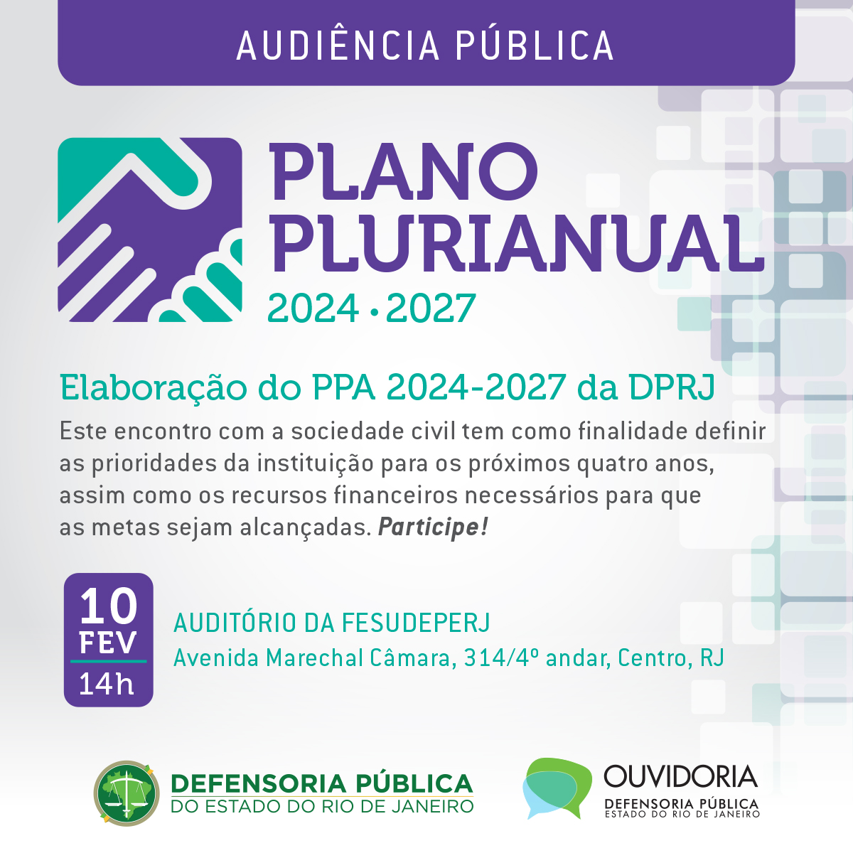 As prioridades da Defensoria Pública nos próximos quatros anos e os recursos financeiros necessários para atingir as metas institucionais são o foco da audiência pública que irá debater o Plano Plurianual (PPA) da DPRJ. Toda a sociedade civil está convidada para o encontro que será realizado em fevereiro (10), às 14h, na sede administrativa da instituição (Avenida Marechal, Câmara, 314 - Centro do Rio de Janeiro).