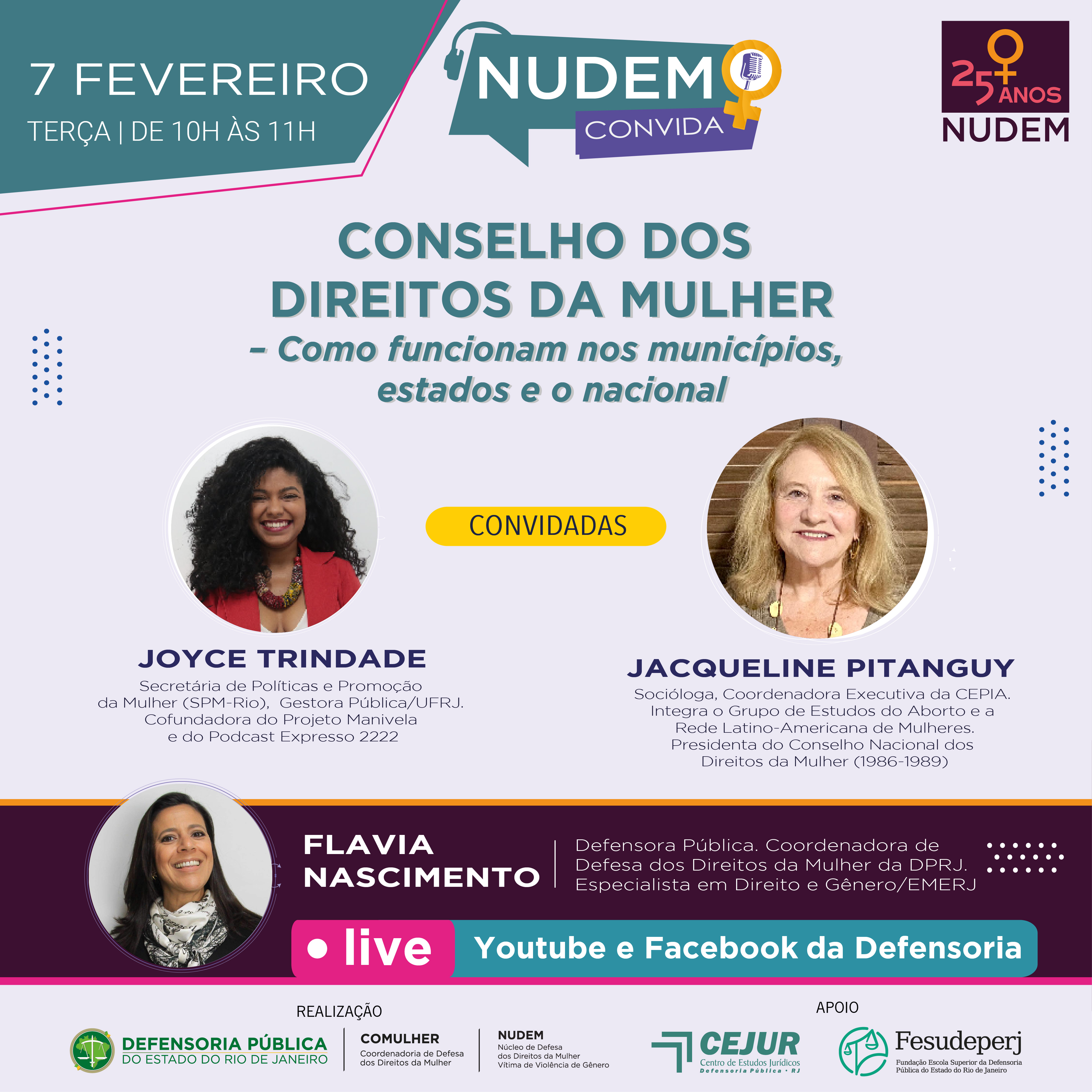 Realizado pelo Núcleo de Defesa dos Direitos da Mulher (Nudem) da DPRJ, com apoio do Centro de Estudos Jurídicos (Cejur) e da Fundação Escola Superior da Defensoria Pública (Fesudeperj), o Nudem Convida traz debates produzidos especialmente para difundir as temáticas que mais impactam a vida das mulheres e aproximá-las da atuação especializada na defesa de direitos. Além das convidadas, o debate do próximo dia 07 é aberto à participação do público terá a mediação da defensora Flávia Nascimento, coordenadora de Defesa dos Direitos da Mulher (Comulher).