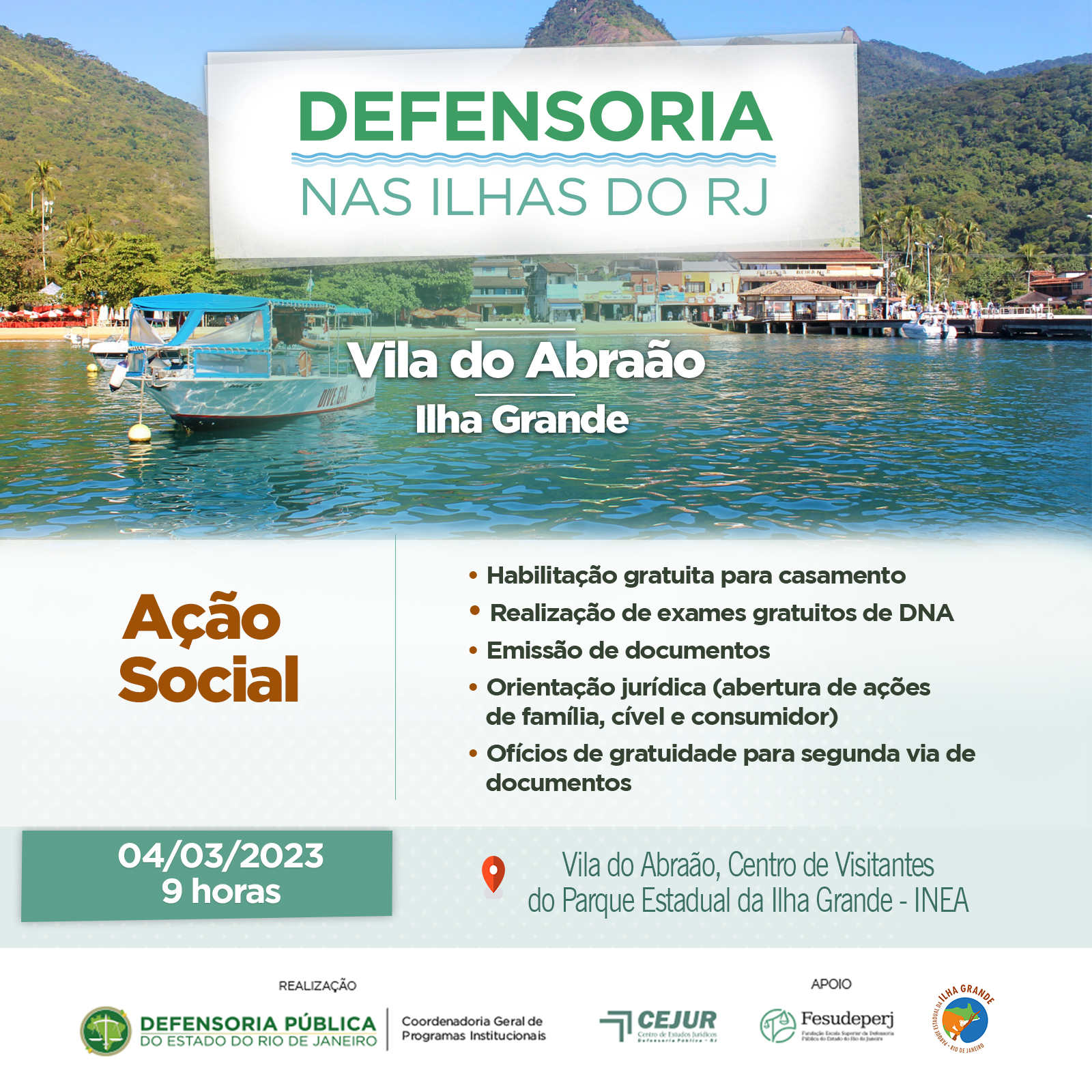 O projeto “Defensoria nas Ilhas” estará presente na Vila do Abraão, em Ilha Grande, Costa Verde do Rio, no próximo sábado, 4 de março. Moradoras e moradores do local terão atendimento para demandas cíveis, de família e consumidor, de qualquer complexidade. Também será possível a realização gratuita de exames de DNA.