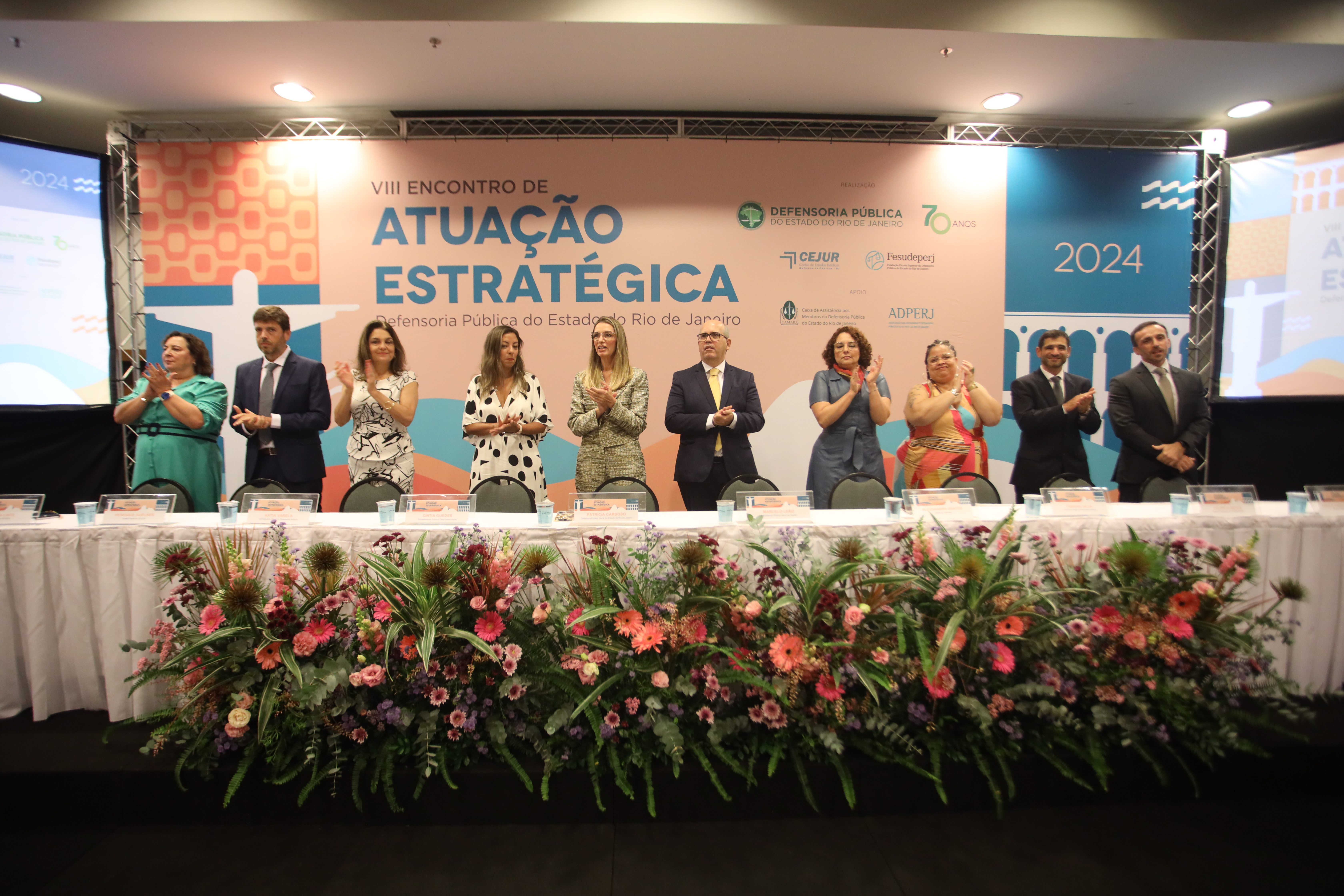 Na mesa de abertura do evento estavam a defensora pública-geral, Patrícia Cardoso; o subdefensor público-geral de Gestão, Marcelo Leão; a subdefensora pública-geral Institucional, Cintia Guedes; a chefe de gabinete, Alessandra Bentes; a corregedora-geral, Kátia Varela; a ouvidora-geral, Fabiana Silva; o diretor-geral do Centro de Estudos Jurídicos (Cejur), Henrique Guelber; o diretor-presidente da Fesudeperj,Felipe Almeida; a presidenta da Adperj, Juliana Lintz; e o diretor-presidente da Camarj, Paulo Vinícius Cozzolino.