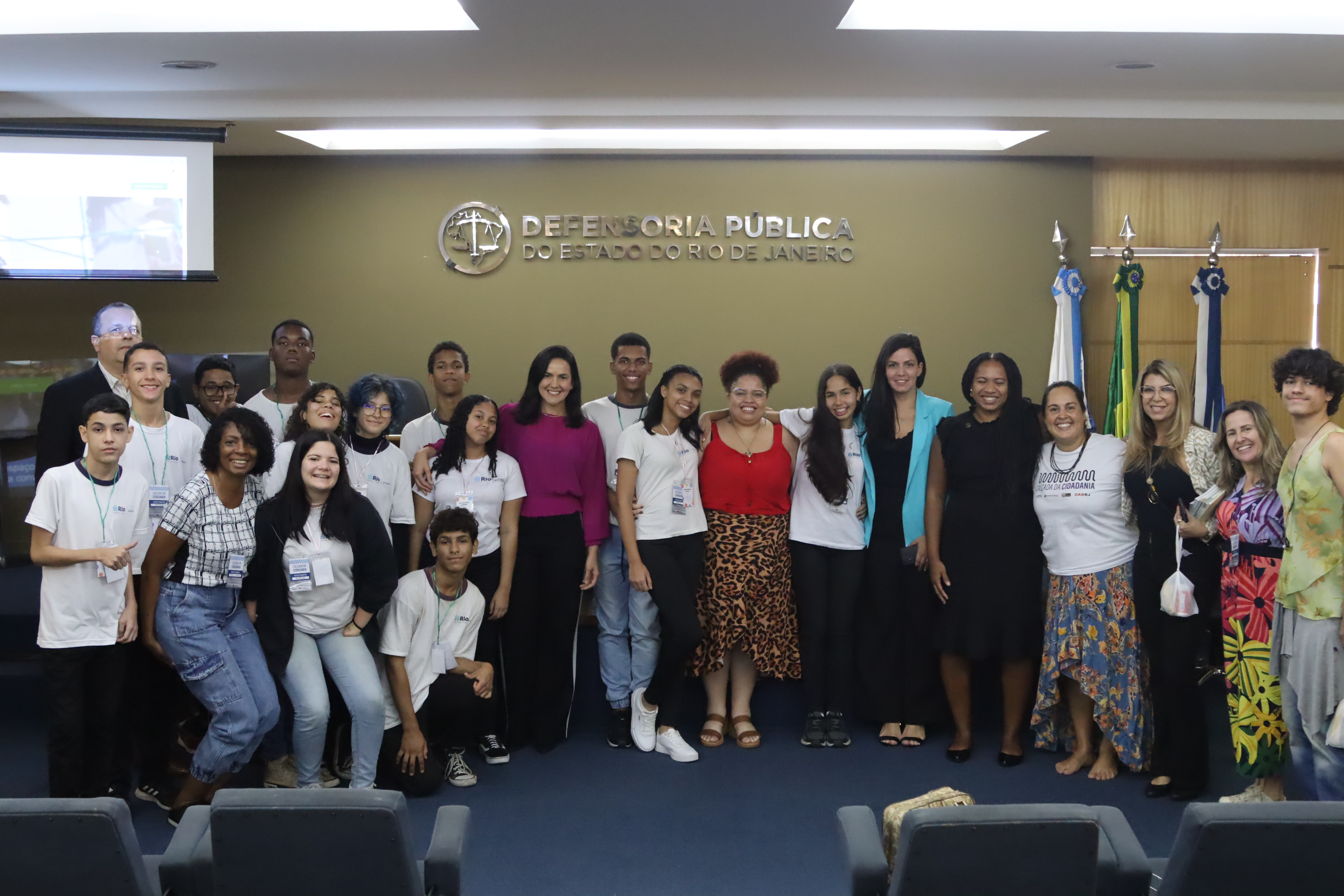Diretamente da Praça Seca, bairro da Zona Oeste do Rio de Janeiro, os estudantes do 9º ano do Ciep Carlos Drummond de Andrade vieram participar do projeto ‘Calçada da Cidadania’, na sede da Defensoria Pública, nesta quinta-feira (27). A iniciativa é fruto de uma parceria entre a DPRJ, o Ministério Público do Rio de Janeiro (MPRJ), o Instituto dos Advogados Brasileiros (IAB) e a Ordem dos Advogados do Brasil (OAB), que compartilha educação em direitos para estudantes da rede pública de ensino.