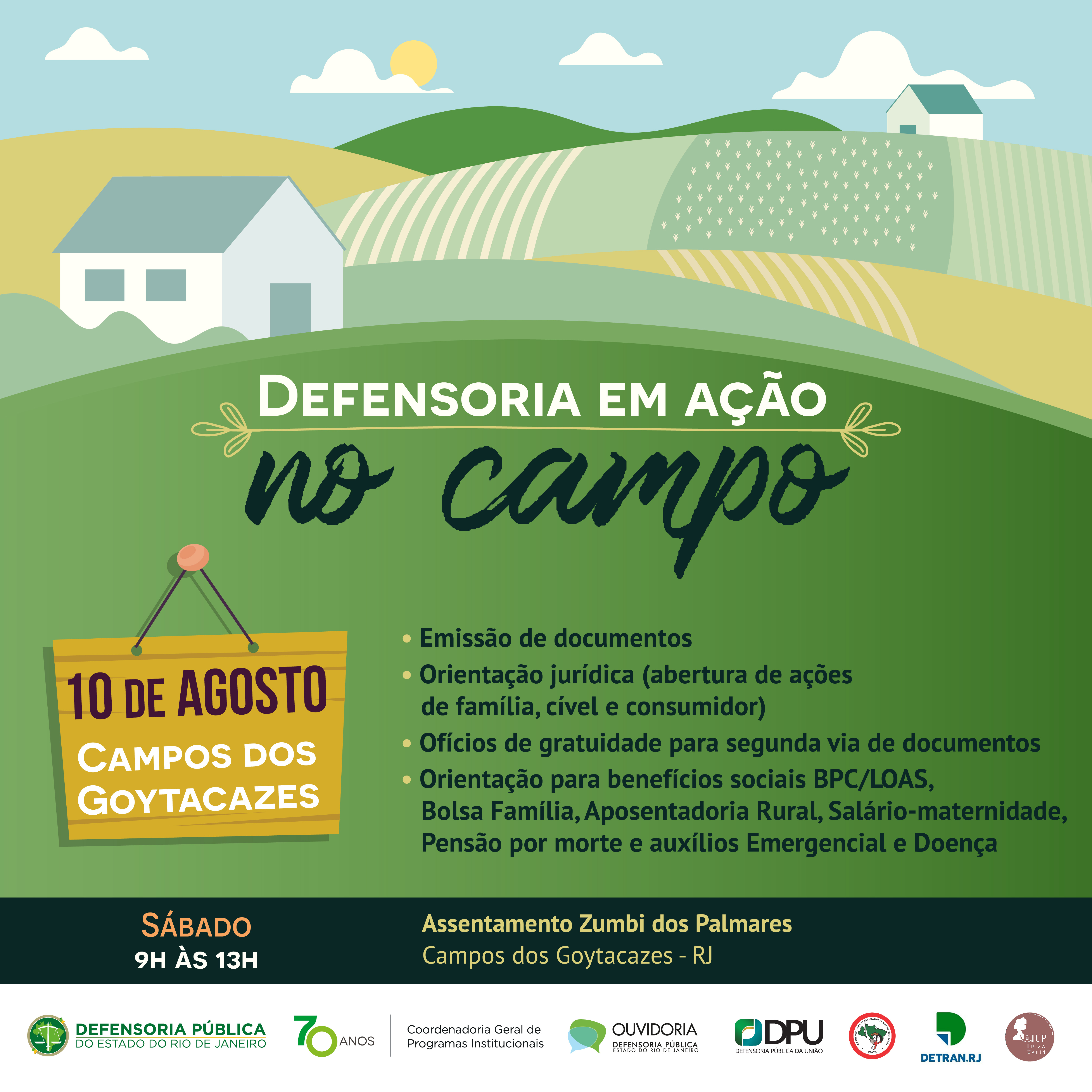 O ‘Defensoria em Ação no Campo’ é um projeto criado pela Coordenação Geral de Programas Institucionais da Defensoria Pública (COGPI), em parceria com a Ouvidoria Externa da DPRJ. O objetivo é promover o acesso à justiça para pessoas em situação de vulnerabilidade, que habitam zonas rurais no Estado do Rio de Janeiro.