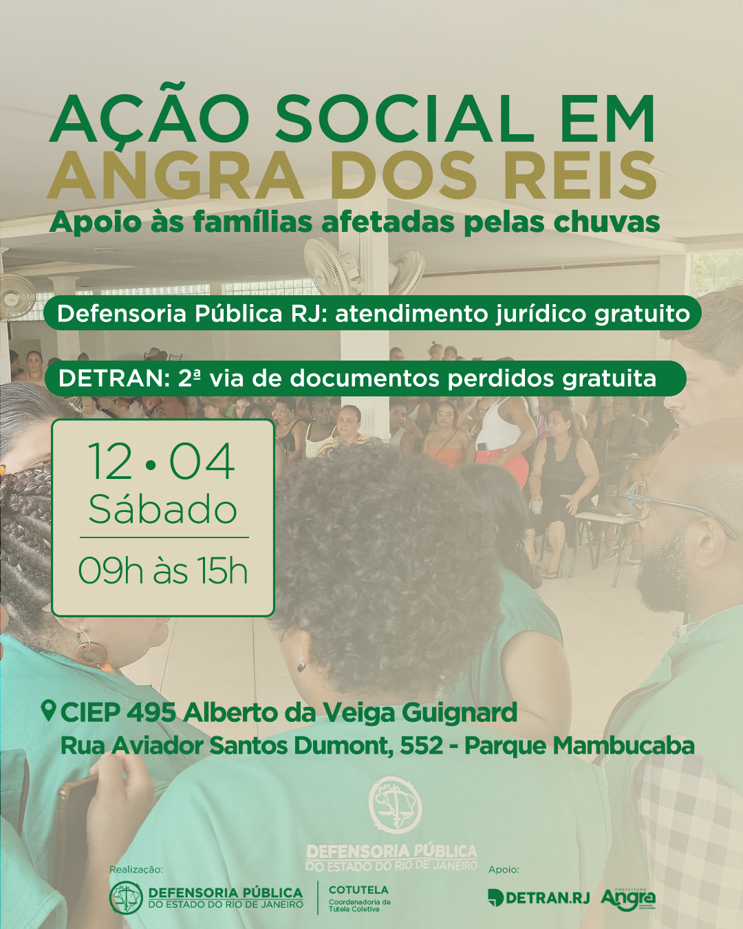 Após um fim de semana marcado por fortes chuvas que deixaram dezenas de famílias desabrigadas, a Defensoria Pública do Estado do Rio de Janeiro, por meio do 9º Núcleo Regional de Tutela Coletiva, realizará no próximo sábado (12) uma grande ação social em Angra dos Reis, na Costa Verde, uma das regiões mais impactadas pelas enchentes no estado. O objetivo é ajudar as pessoas afetadas a recomeçarem a vida após a tragédia do último fim de semana (5 e 6 de abril).
