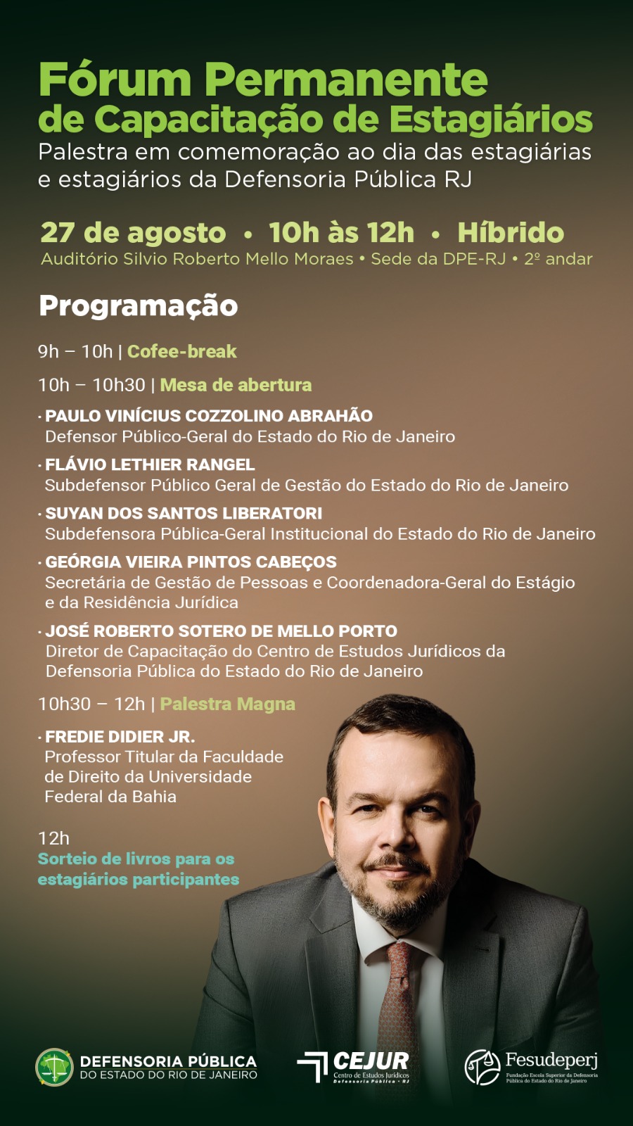 O ponto alto do evento será a Palestra Magna, ministrada das 10h30 às 12h pelo advogado e professor da Universidade Federal da Bahia, Fredie Didier Jr., referência no campo do Direito Processual. Ao final, o palestrante sorteará livros de sua autoria entre os estagiários presentes de forma online ou presencial.