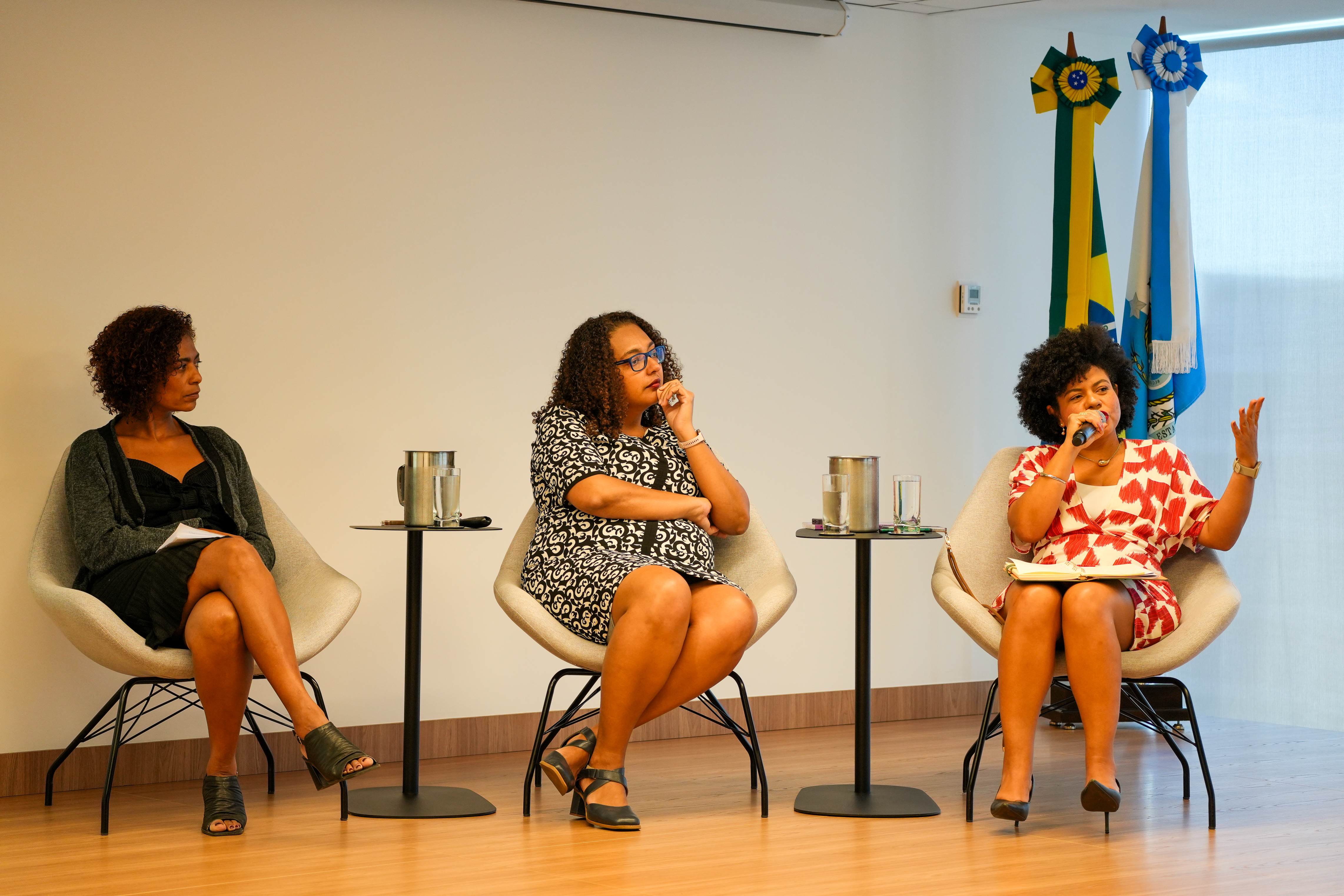 A Defensora Pública Thaís Lima, coordenadora da Coordenação de Promoção e Defesa dos Direitos da Mulher (COMULHER), compôs a mesa e reforçou a importância de trazer o debate sobre gênero e raça para o centro das instituições públicas e privadas, com uma abordagem interseccional.
