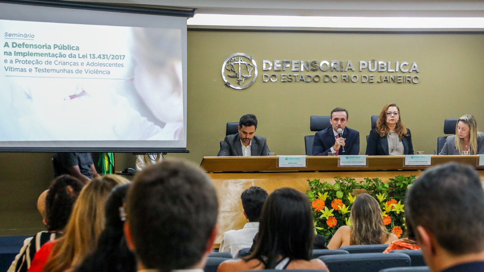 A mesa de abertura foi composta pelo Defensor Público-Geral da DPRJ, Paulo Vinícius Cozzolino Abrahão; pela Subdefensora Pública-Geral Institucional, Suyan dos Santos Liberatori; pelo Oficial de Proteção à Criança e consultor do UNICEF no Rio de Janeiro, Marcos Kalil; pela Coordenadora da Infância e Juventude da DPRJ (COINFÂNCIA), Letícia Kirchhoff; além de Benedito Rodrigues, consultor nacional do UNICEF Brasil, e Michael Farias, secretário municipal de Desenvolvimento Social de Vitória da Conquista.