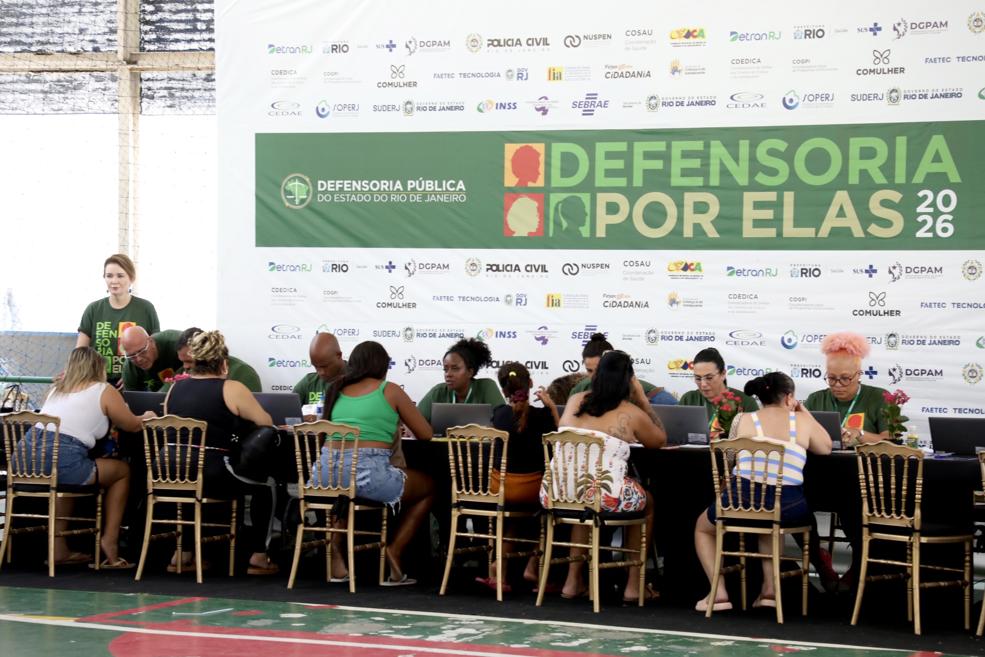 A quadra do Complexo Esportivo da Rocinha se transformou, neste sábado (7), em um grande ponto de acesso a direitos para moradores da Rocinha e do entorno. Das 9h às 15h, a população circulou pelo espaço em busca de orientação jurídica, serviços públicos e debates sobre cidadania durante o evento “Defensoria por Elas”, promovido pela Defensoria Pública do Estado do Rio de Janeiro (DPRJ) em alusão ao Dia Internacional da Mulher.