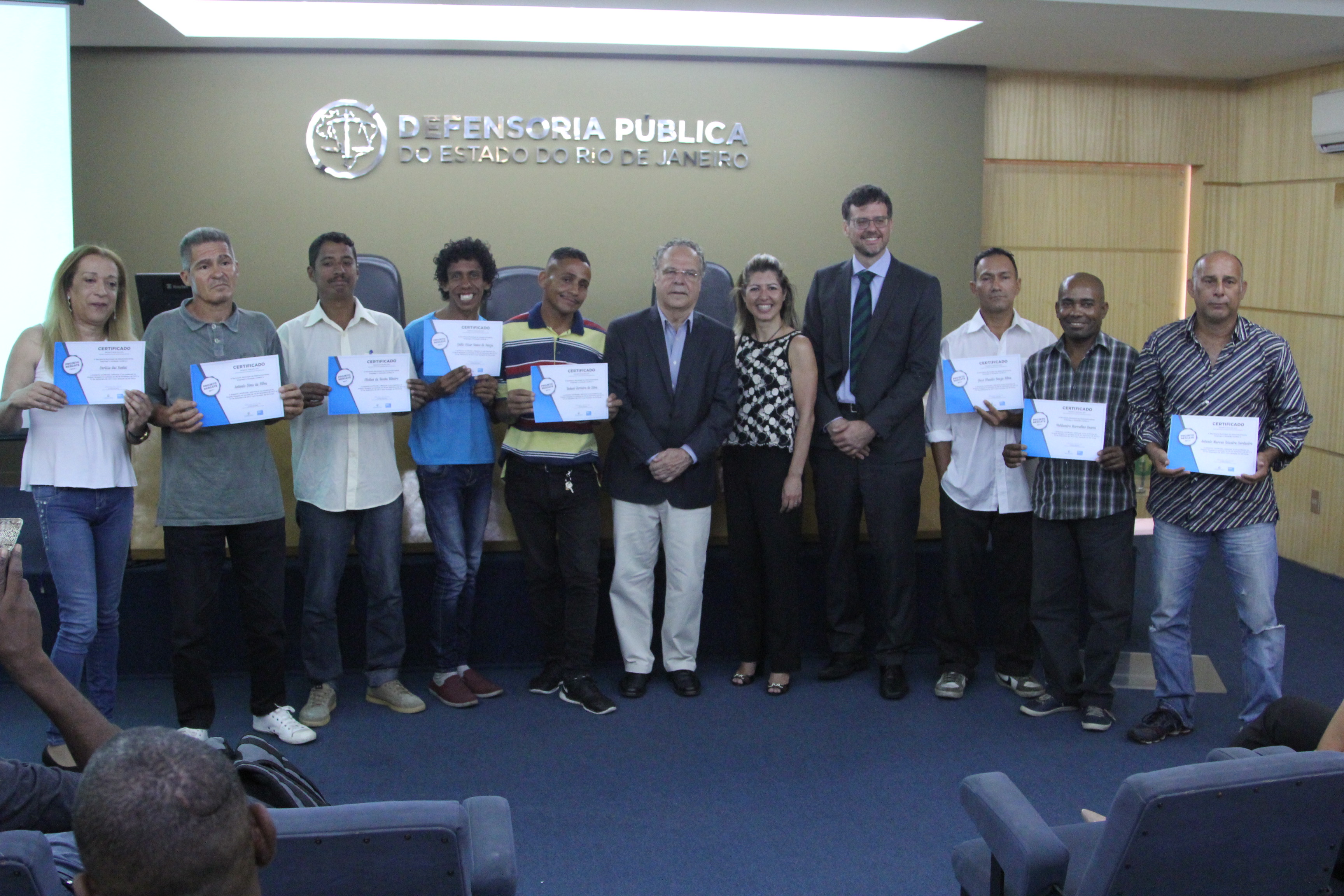 Mais oito pessoas em situação de rua estão prestes a garantir inserção no mercado de trabalho formal graças ao Projeto Resgate, parceria entre a Defensoria Pública do Rio e a Prefeitura. A breve cerimônia de encerramento do curso de capacitação terminou com a entrega de certificados de conclusão e de cartas de encaminhamento para entrevista de emprego, já na próxima sexta-feira, dia 13. As vagas são para auxiliar de limpeza. Essa foi a quarta formatura do Resgate: 22 homens e mulheres que passaram pelas três primeiras turmas do projeto já foram contratados por empresas madrinhas.