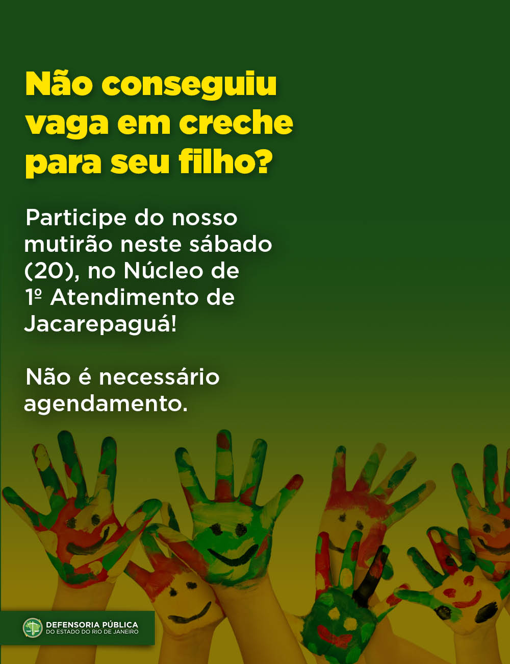 A Defensoria Pública do Rio de Janeiro (DPRJ) promoverá um mutirão específico para os casos de falta de vagas nas creches e pré-escolas do município. A ação especializada ocorrerá neste sábado (20), das 9h às 15h, no Núcleo de Primeiro Atendimento da DPRJ em Jacarepaguá, localizado na Rua Padre Ventura, nº 50, Taquara, próximo ao Fórum e à Delegacia. Não é necessário agendamento para ser atendido.