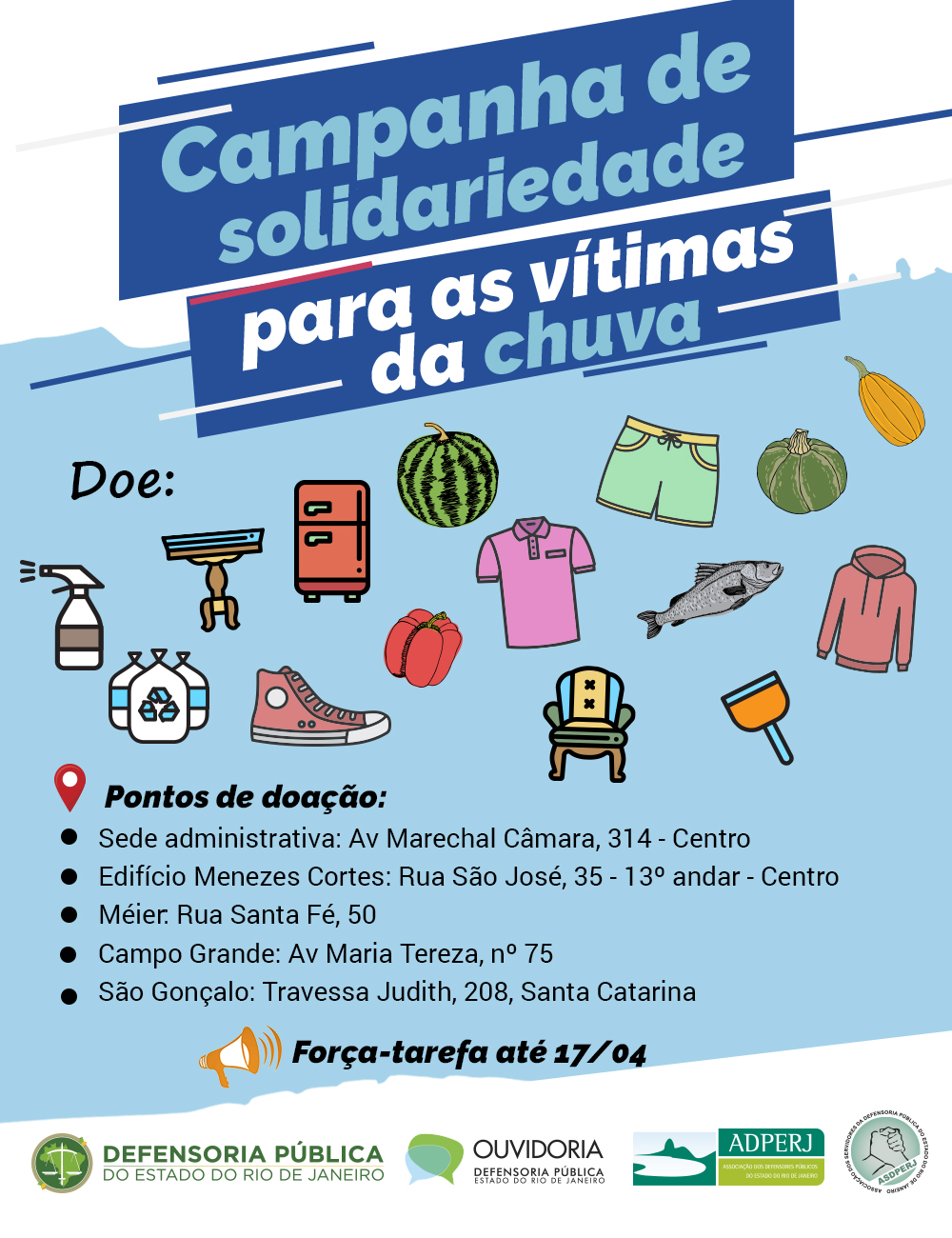 Diante dos estragos causados pelas fortes chuvas esta semana no Rio de Janeiro, que resultou na morte de 10 pessoas, deslizamentos e casas alagadas, a Defensoria Pública do Rio de Janeiro (DPRJ), além da ação cautelar ajuizada contra o município do Rio, informa que está recolhendo doações para as vítimas em diferentes pontos da cidade. Roupas de todos os tamanhos, roupas de cama e banho, alimentos não perecíveis, água potável, produtos de limpeza, móveis, colchonetes e itens de higiene pessoal feminino podem ser entregues até a próxima quarta-feira (17), antes do feriado prolongado, nos pontos de doação.