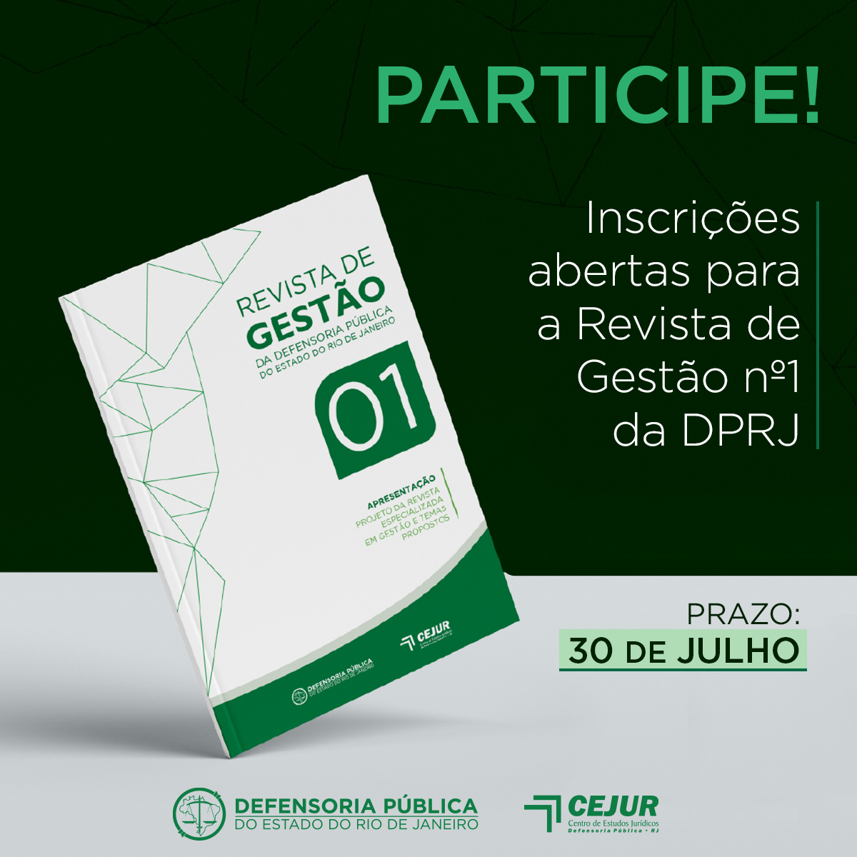 Estão abertas, até 30 de julho, as inscrições para o envio de trabalhos e artigos para compor a primeira edição da Revista de Gestão da Defensoria Pública. A publicação é uma iniciativa do Centro de Estudos Jurídicos da Defensoria Pública do Rio de Janeiro (CEJUR), com apoio da Secretaria de Engenharia.