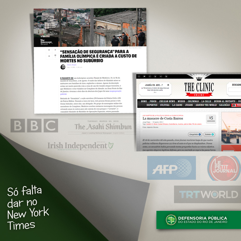 O trabalho da Defensoria Pública do Rio rompeu as fronteiras e é destaque na imprensa internacional. Nas últimas semanas, temas como as remoções na Vila Autódromo, a situação dos jovens no sistema socioeducativo, as manifestações políticas dentro dos estádios e as violações de direitos da população em situação de rua foram destaque em veículos como The Intercept, TRT World (TV Turca), TV Arte / Autobus Productions (TV franco-alemã), The Wall Street Journal (EUA), The Asahi Shimbun (Japão), Irish Independent (Inglaterra), BBC de Londres, Petit Journal (França), The Clinic (Chile) e a Agência France Press (AFP).