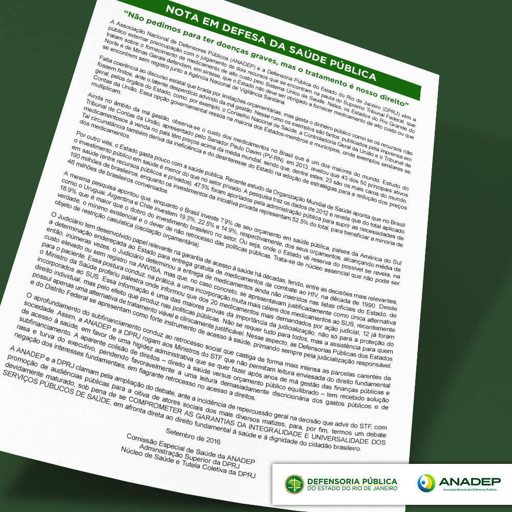 A Associação Nacional de Defensores Públicos (ANADEP) e a Defensoria Pública do Estado do Rio de Janeiro (DPRJ) vêm a público externar preocupação com o julgamento de dois recursos que se encontram na pauta do Supremo Tribunal Federal, que tratam sobre o fornecimento de medicamento de alto custo pelo Sistema Único de Saúde. Neles, os Estados do Rio Grande do Norte e de Minas Gerais defendem, em síntese, que o Estado não deve ser obrigado a fornecer medicamento de alto custo ou que se encontrem sem registro junto a Agência Nacional de Vigilância Sanitária.