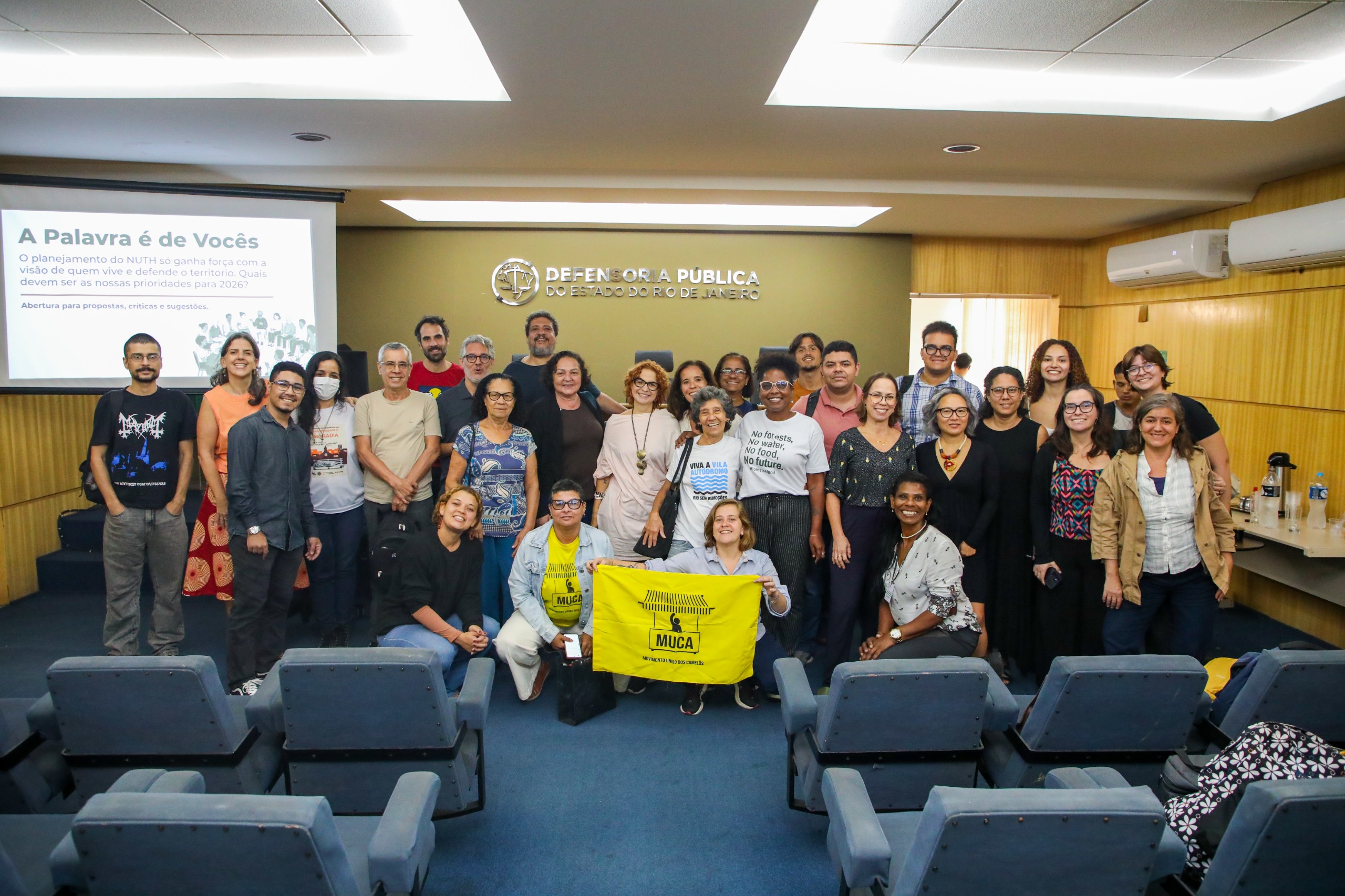 A Defensoria Pública do Estado do Rio de Janeiro (DPRJ), por meio do Núcleo de Terras e Habitação (NUTH), realizou nesta terça-feira (10) a reunião de planejamento anual no auditório do segundo andar da sede administrativa. O encontro reuniu as Defensoras Públicas do núcleo, moradores de comunidades atendidas, membros de núcleos de pesquisa da UFRJ e representantes de movimentos sociais ligados à pauta do direito à moradia.