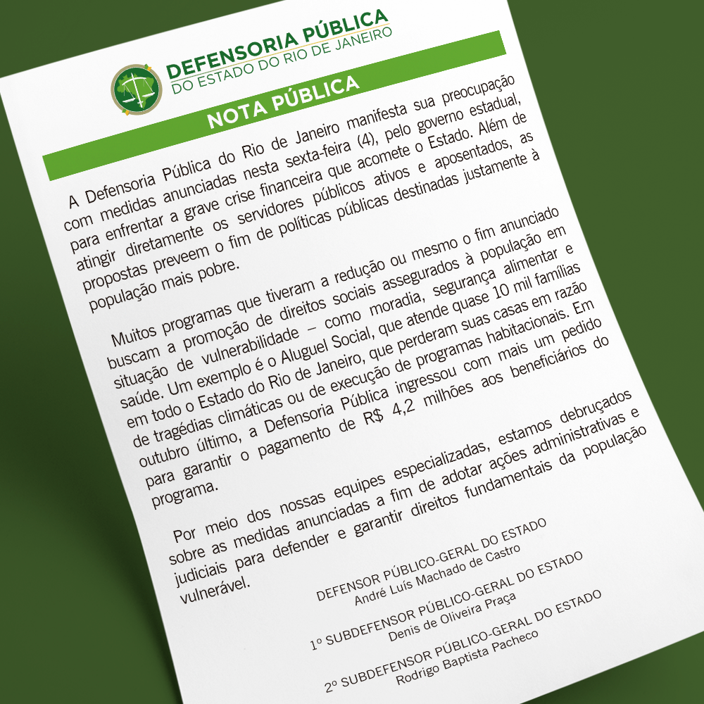 A Defensoria Pública do Rio de Janeiro manifesta sua preocupação com as medidas anunciadas nesta sexta-feira (4), pelo governo estadual, para enfrentar a grave crise financeira que acomete o Estado. Além de atingir diretamente os servidores públicos ativos e aposentados, as propostas preveem o fim de políticas públicas destinadas justamente à população mais pobre.