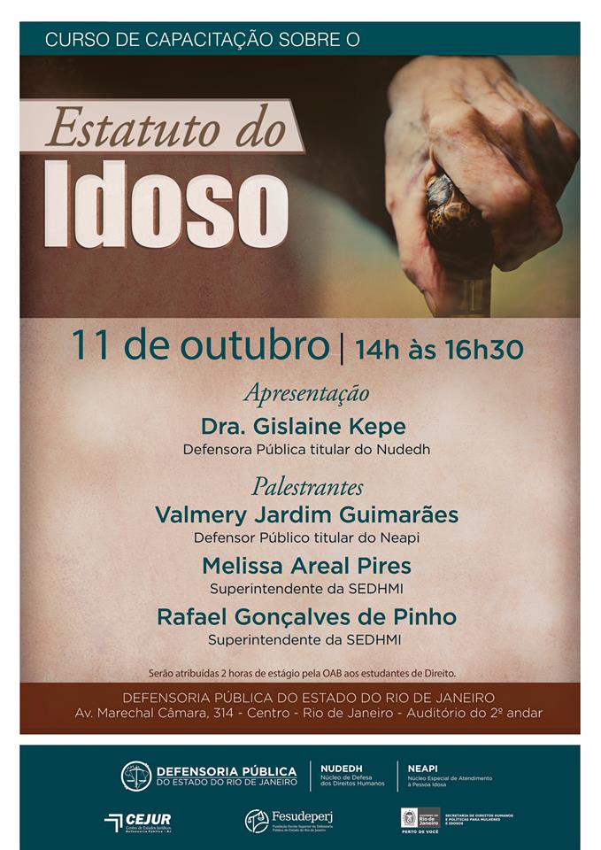 As inovações trazidas pelo Estatuto do Idoso e as questões enfrentadas no atendimento à pessoa idosa pela Defensoria Pública do Estado do Rio de Janeiro (DPRJ) serão debatidas, na próxima quarta-feira (11), no Curso de Capacitação sobre o Estatuto do Idoso a ser promovido pela instituição. Na ocasião, também serão abordados temas como a legislação relacionada ao transporte público e à saúde, além das mudanças nos limites da curatela e os requisitos para a concessão de benefícios sociais.