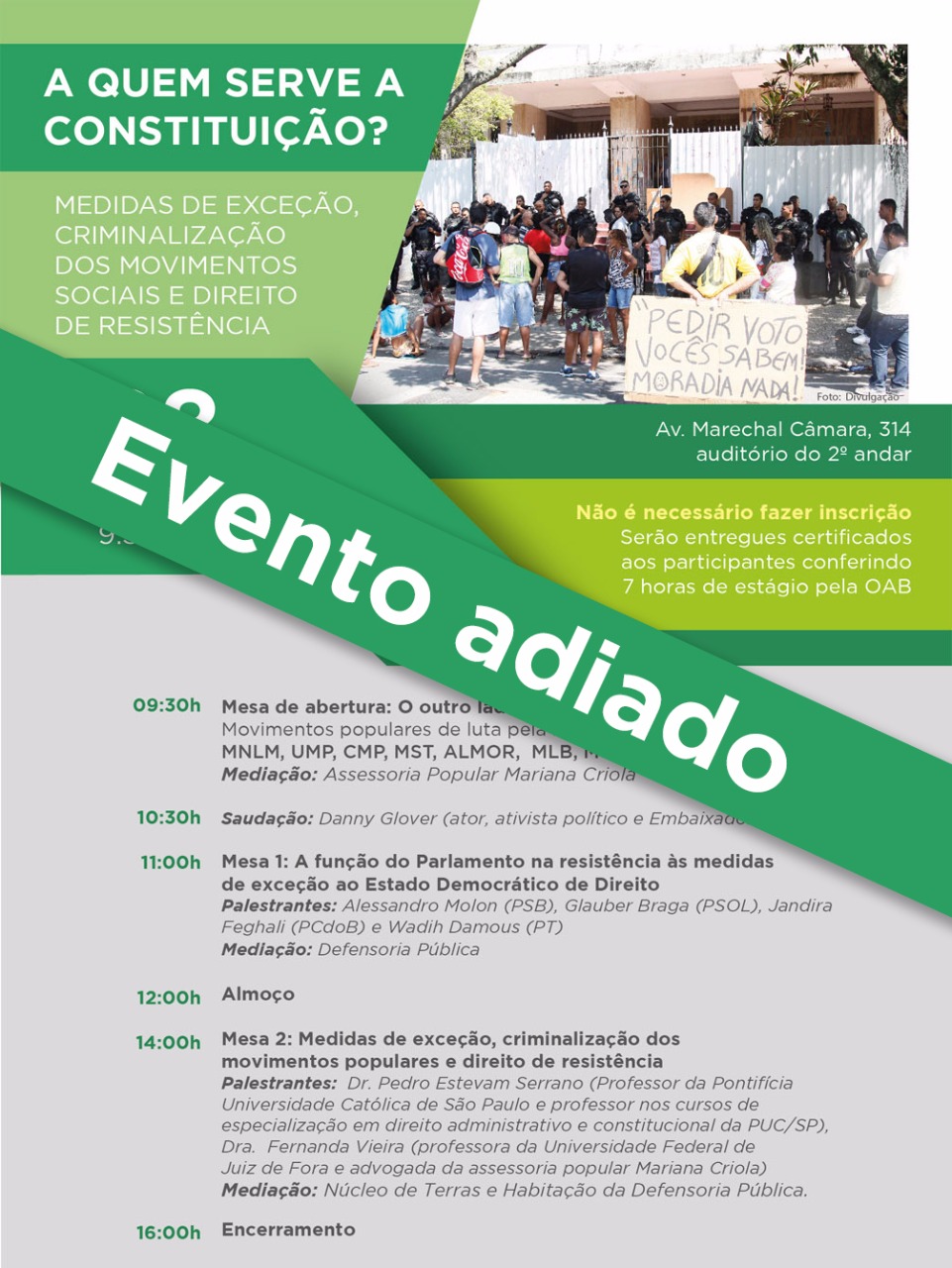 Realizado pela Defensoria Pública do Rio em parceria com movimentos sociais de luta pela moradia e pela terra, o seminário tem como objetivo debater as consequências dos projetos de lei em tramitação na Câmara dos Deputados e no Senado Federal que, se forem aprovados, vão criminalizar os movimentos sociais que têm como foco as ocupações urbanas e rurais. Em breve uma nova data para a realização do evento será informada.