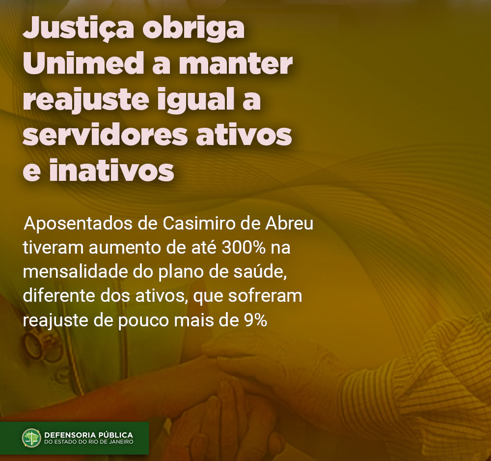 A Defensoria Pública de Casimiro de Abreu, interior do Rio de Janeiro, em razão de Ação Civil Publica, obteve liminar favorável na justiça que obriga a empresa de plano de saúde Unimed - Costa do Sol manter reajustes nas mensalidades iguais para servidores ativos e inativos do município. Na última correção feita pela empresa, que presta serviços de saúde para a prefeitura, houve aumento abusivo de cerca de 300% na parcela de manutenção cobrada aos aposentados. A decisão foi deferida pelo Juízo da Vara única de Casimiro de Abreu, da Justiça do Rio de Janeiro (TRJRJ), e entende-se que a quantia exorbitante cobrada a estes usuários, inviabilizaria o pagamento, e os tornariam inadimplentes, provocando a suspensão do serviço afetando a saúde desses beneficiários.