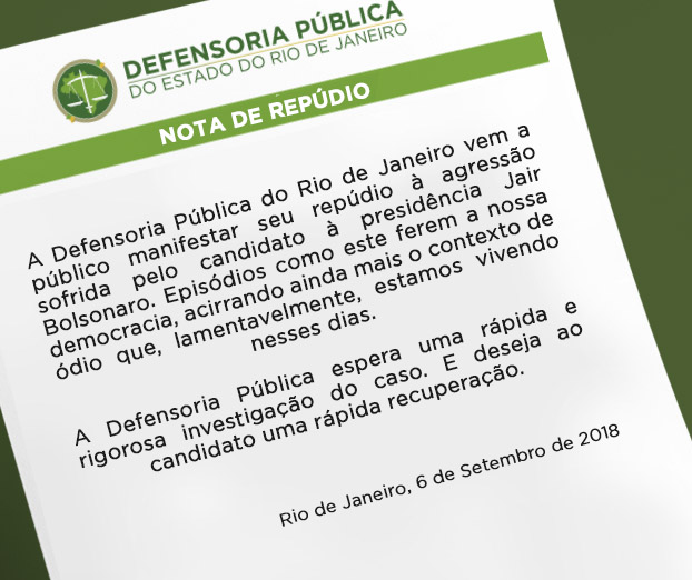 A Defensoria Pública do Rio de Janeiro vem a público manifestar seu repúdio à agressão sofrida pelo candidato à presidência Jair Bolsonaro. Episódios como este ferem a nossa democracia, acirrando ainda mais o contexto de ódio que, lamentavelmente, estamos vivendo nesses dias.