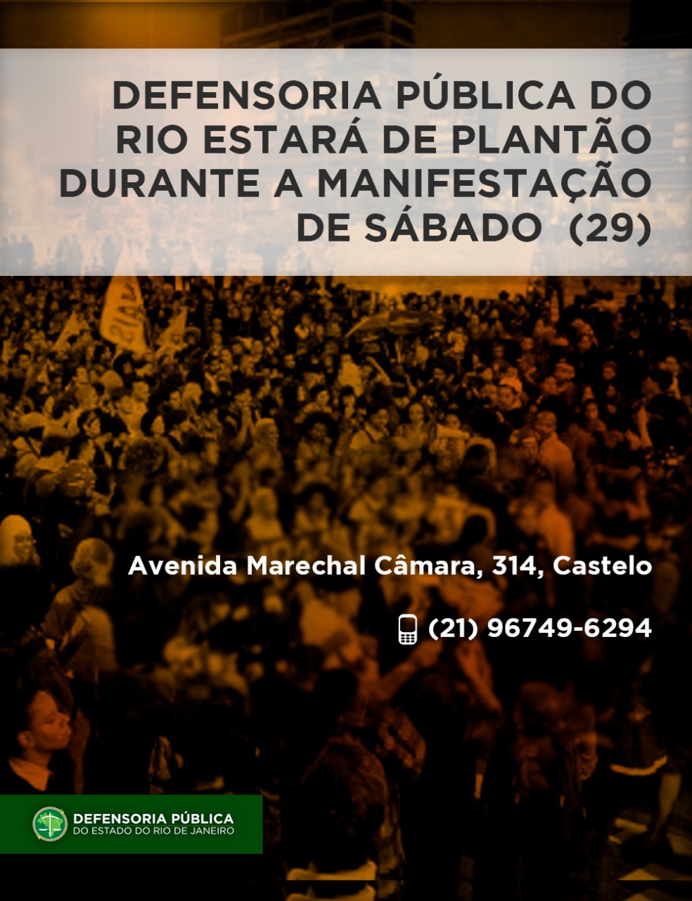 A Defensoria Pública do Rio de Janeiro vai acompanhar o ato público do próximo sábado (29) para garantir o direito de todas e todos à livre manifestação. Nossos defensores estarão à disposição, por telefone ou presencialmente, para atender àqueles que tiverem seus direitos violados.