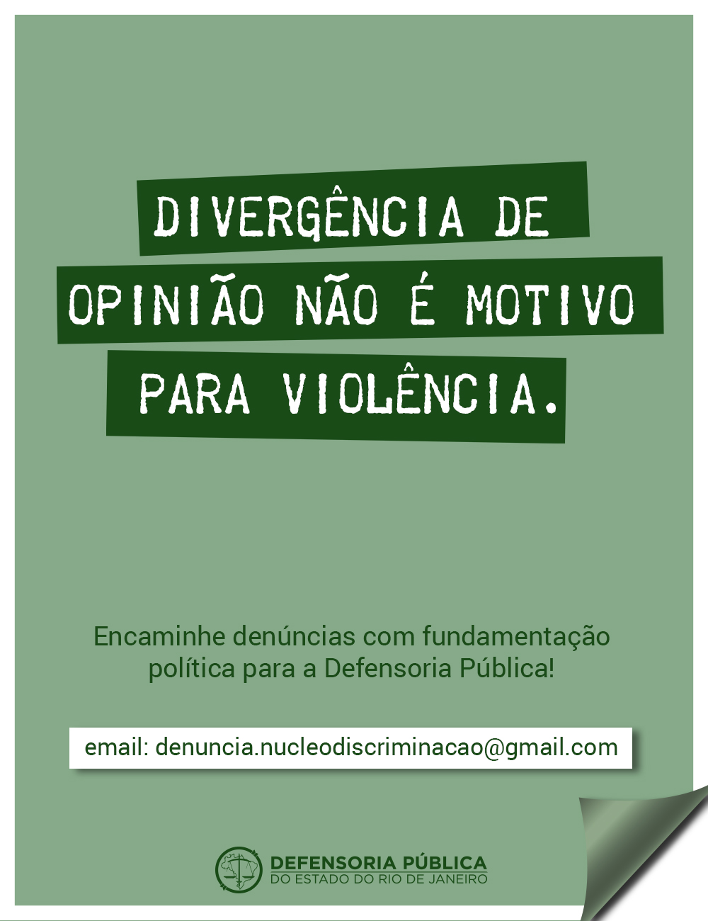 A Defensoria Pública informa que denúncias de casos de LGBTIfobia, racismo e violência contra a mulher, com fundamentação política, ocorridos no Estado do Rio de Janeiro podem ser comunicados pelo email denuncia.nucleodiscriminacao@gmail.com. Nossos defensores colocam-se à disposição para prestar assistência jurídica a todas e todos que forem vítimas de agressões ou intimidação.
