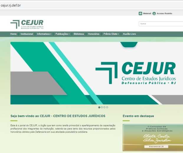 O Novo Portal do Centro de Estudos Jurídicos (Cejur) da Defensoria Pública do Rio de Janeiro (DPRJ) é mais uma ferramenta para a difusão de informações institucionais. Para o público externo, um canal de aproximação a temas jurídicos. Traz conteúdo atualizado em relação ao site anterior, com as mais recentes ações e atribuições destinadas ao Cejur.