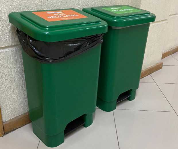 O modelo adotado foi a separação simplificada: recicláveis (seco) e não recicláveis (úmido). Junto aos coletores, foi disponibilizado um cartaz com orientações
