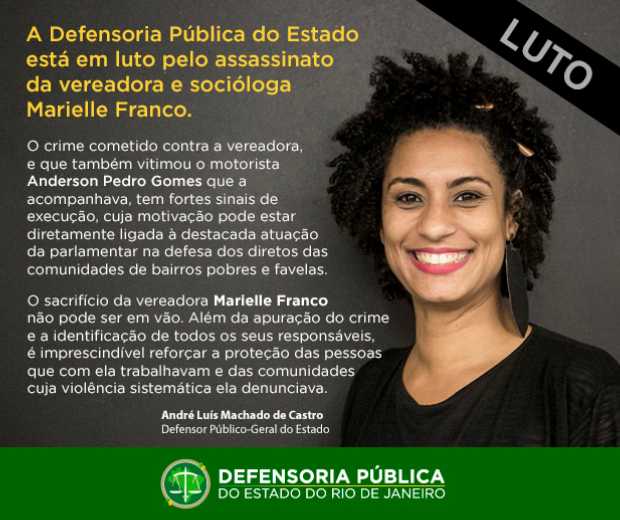 A Defensoria Pública do Estado do Rio de Janeiro (DPRJ) está em luto pelo assassinato da vereadora e socióloga Marielle Franco.