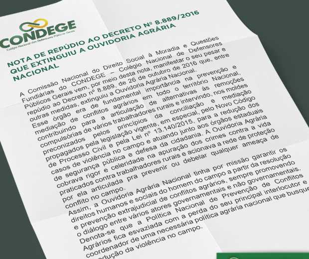 Colégio Nacional dos Defensores Públicos Gerais divulga nota de repúdio contra o Decreto nº 8.889/2016, que extinguiu a Ouvidoria Agrária Nacional.