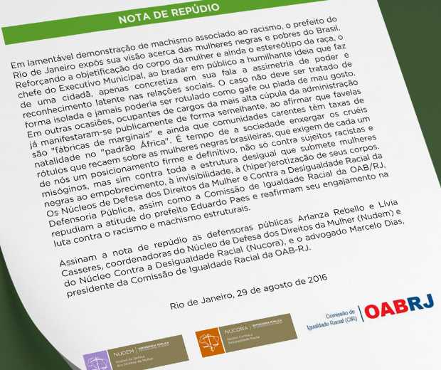 Em nota, os Núcleos de Defesa dos Direitos da Mulher e Contra a Desigualdade Racial da DPRJ e a Comissão de Igualdade Racial da OAB repudiam o prefeito Eduardo Paes.