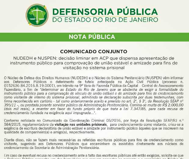 Decisão judicial em Ação Civil Pública movida pela DPRJ proíbe o Estado de exigir escritura pública para comprovação de união estável ou de amizade em visitação